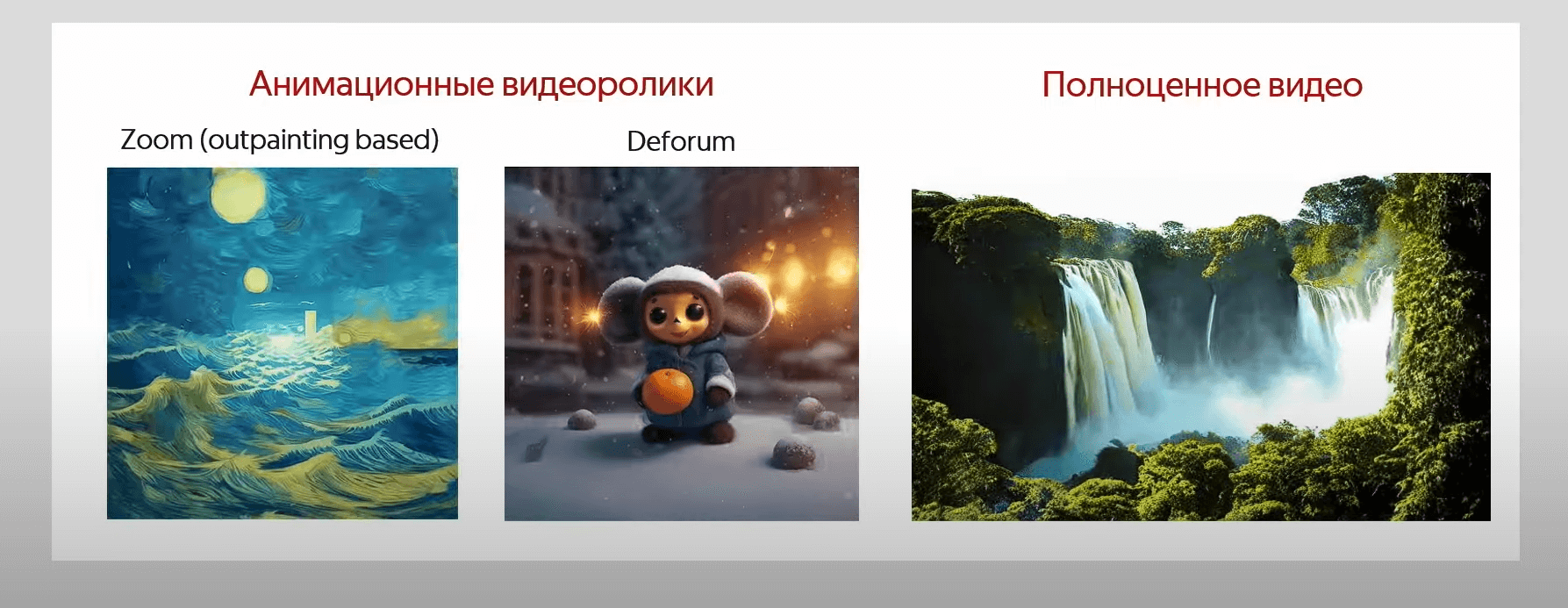 Генерацию видео можно разделить на две части: анимационные видеоролики и полноценное видео. В анимационном видеоролике объект не двигается, анимация моделирует пролёт камеры вокруг статичного объекта. Например, в случае zoom in / zoom out анимации есть исходное изображение, и мы дорисовываем окружение с помощью inpainting или outpainting. Затем приближаем или отдаляем изображение.