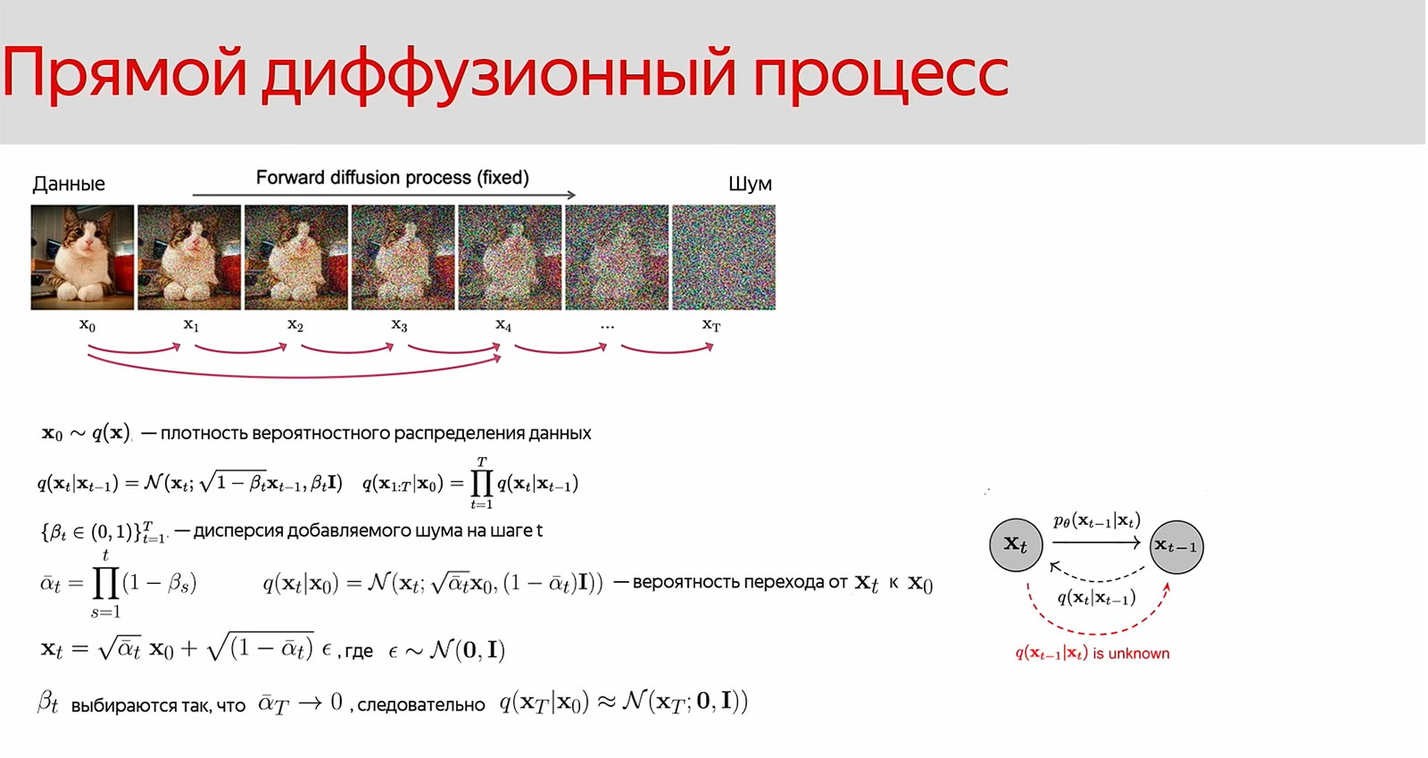Диффузионный процесс состоит из прямого (генерация изображения) и обратного (устранение шума). Нейросеть использует текстовое описание и из шума пошагово получает изображение.