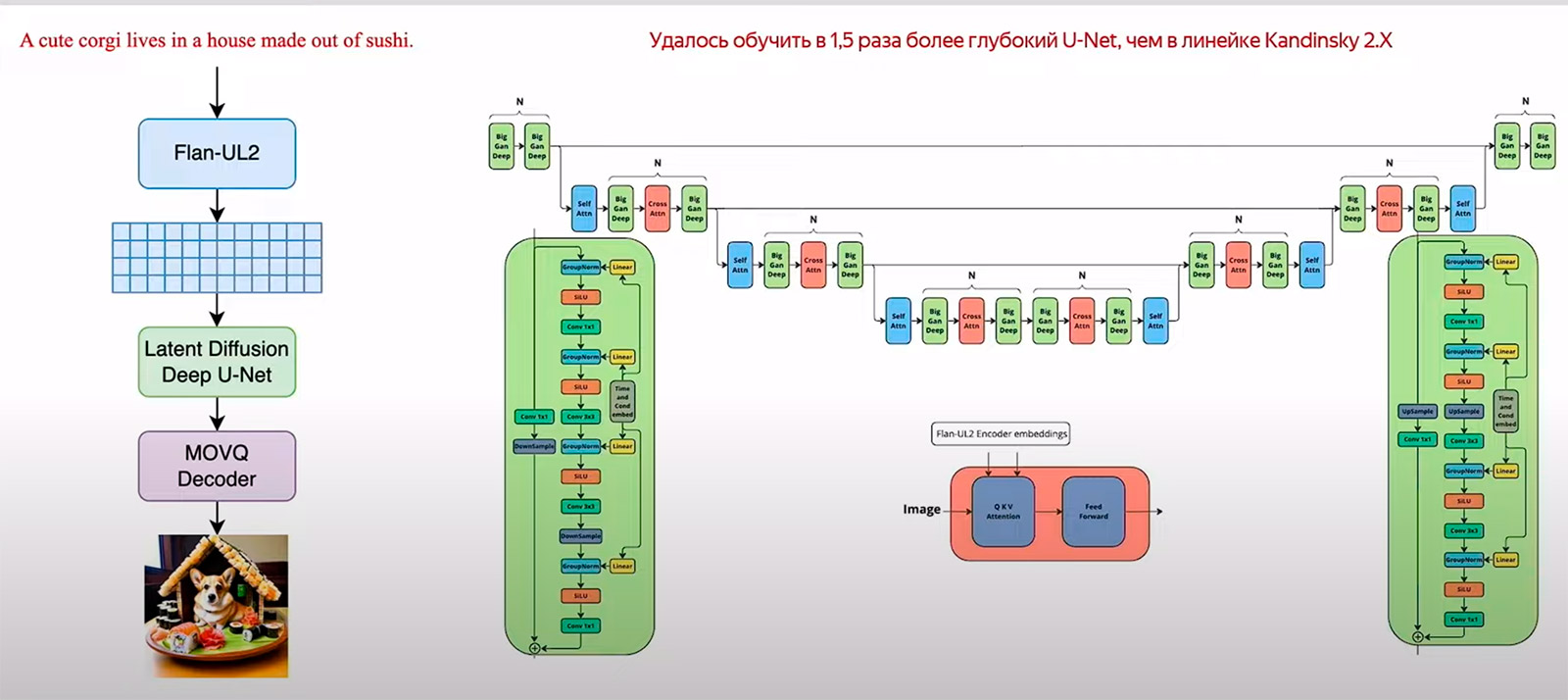 В Kandinsky 3.0 используется прокачанная версия U-Net, у которой расположение блоков отличается от того, которое использовалось для первой версии. Если мы хотим сгенерировать картинку по тексту, нужно модифицировать слои U-Net — через cross-attention добавить эмбеддинг текста.