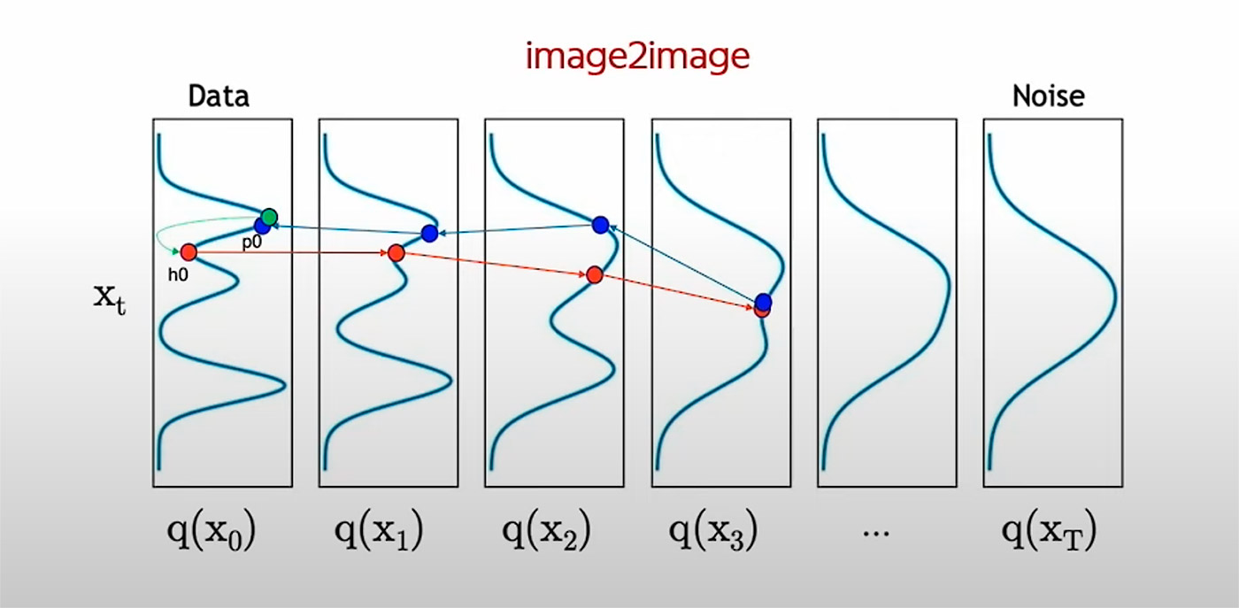 На рисунке ниже изображён image2image режим работы диффузионных моделей. Его используют, поскольку у псевдо-3D-преобразований качество картинки не очень хорошее. Вы берёте изображение и используете предобученную модель. Стартуете с красной точки h0 с маленькой вероятностью, то есть изображение нереалистичное. Вы зашумляете его примерно на 20 шагов, а потом расшумляете обратно той же моделью. Красная точка становится синей, которая более вероятна с точки зрения данных и более реалистична для человека. Таким образом можно исправлять артефакты.