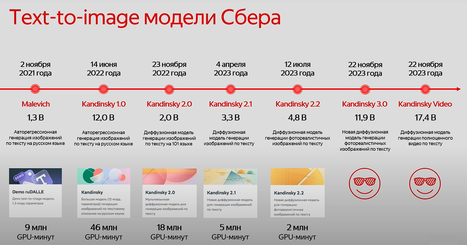 В конце 2023 года разработчики представили модели Kandinsky 3.0 и Kandinsky Video.