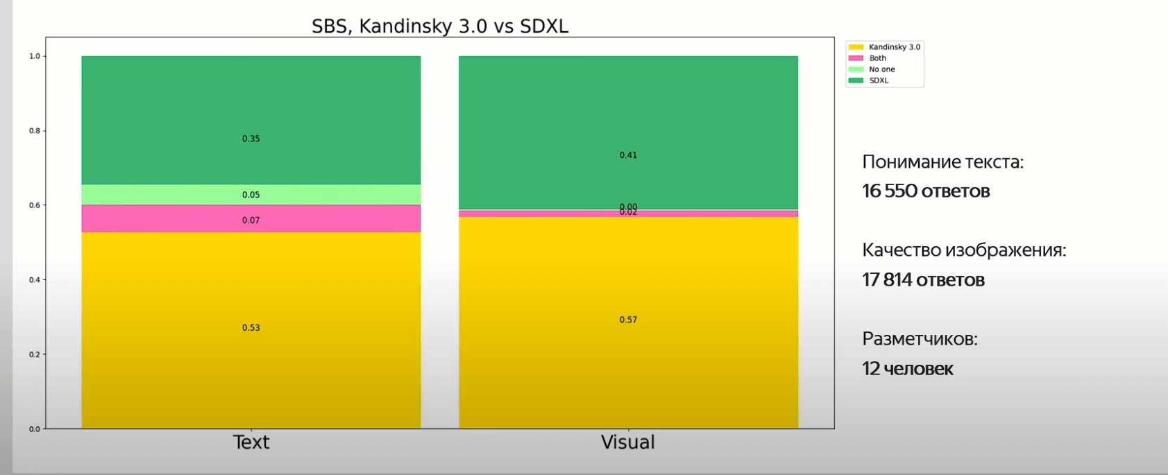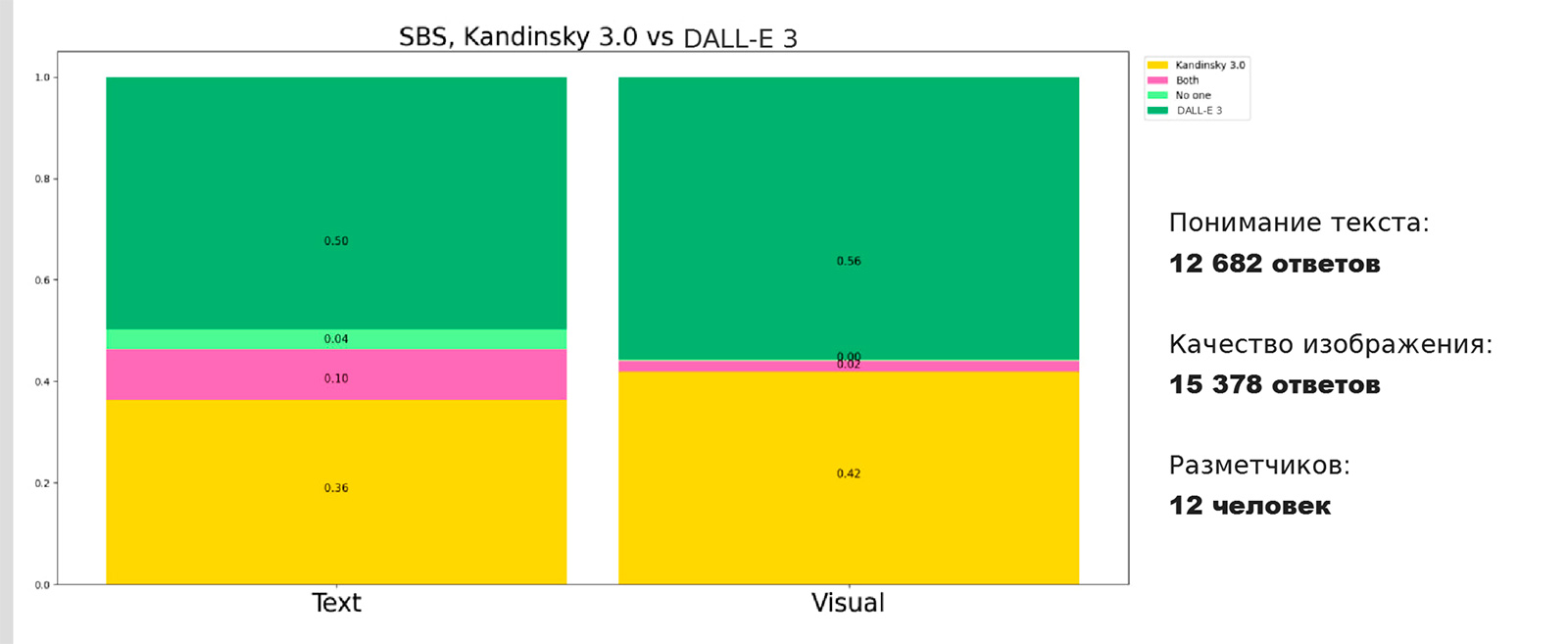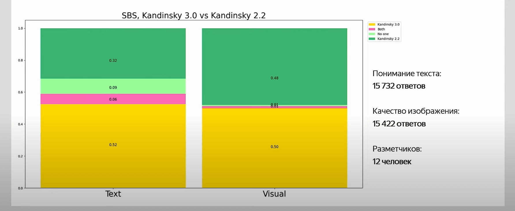 Для сравнения Kandinsky 2.2 и Kandinsky 3.0 создали бота и опрашивали двенадцать человек. В первом случае показывали респондентам текстовое описание и две картинки, одна из которых сгенерирована на основании текста моделью Kandinsky 2.2, а вторая — Kandinsky 3.0. Спрашивали, какая картинка больше подходит по смыслу к исходному описанию. Версия 3.0 превзошла версию 2.2 — 0,53 против 0,32.