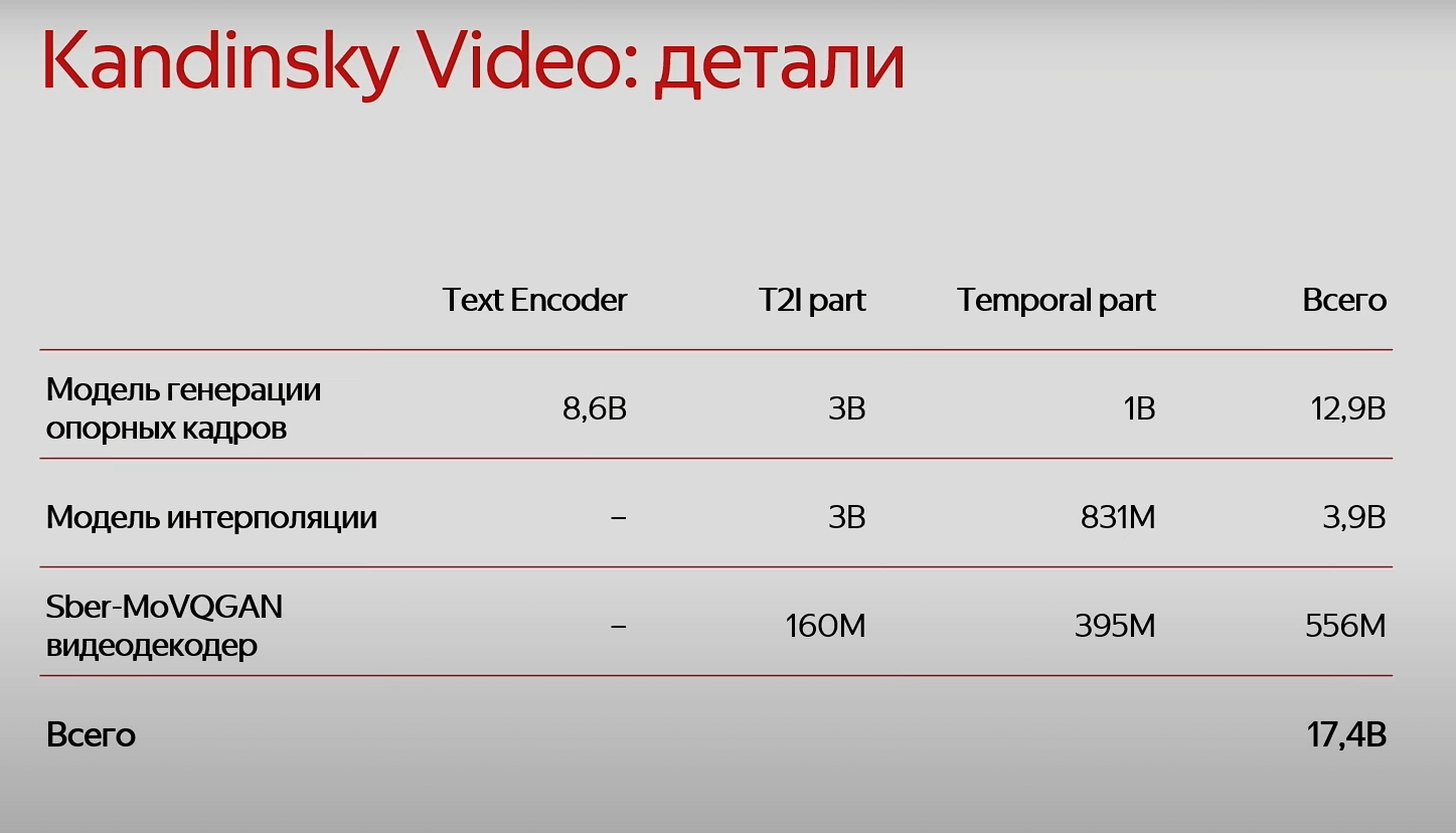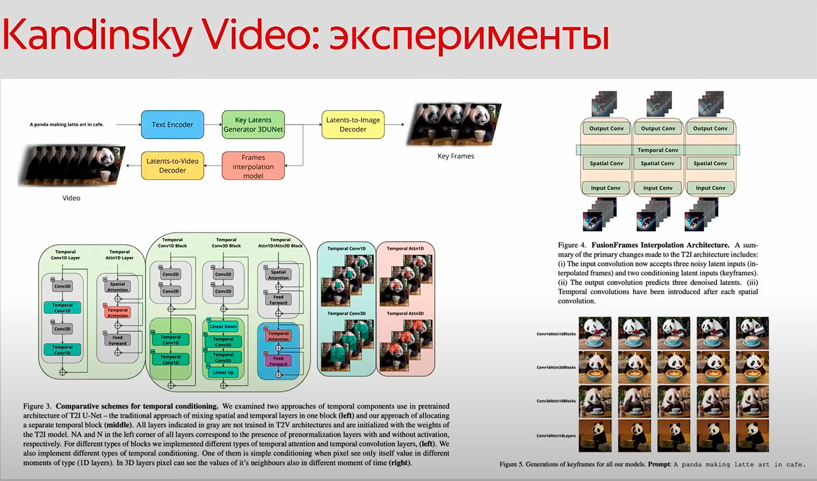 Архитектура. Kandinsky Video состоит из текстового энкодера, модели генерации опорных кадров и модели интерполяции, после которой получается полноценное видео. Модели учатся по отдельности.