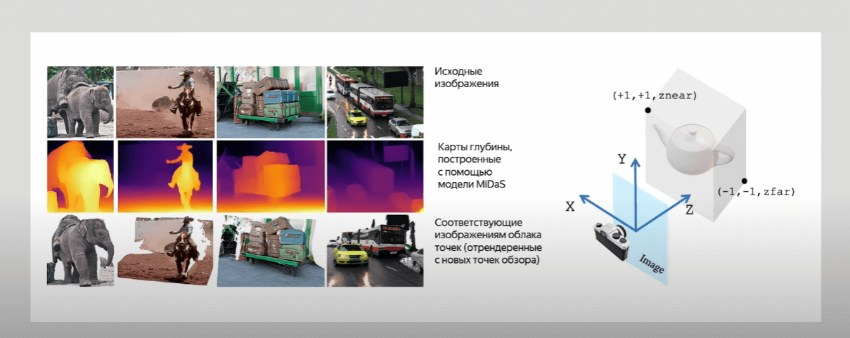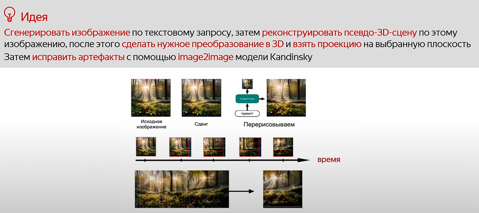 Генерируем по тексту изображение любой моделью, например диффузионной. Потом реконструируем псевдо-3D-сцену над этим изображением. На вход есть эффект, например zoom in. Моделируем в 3D-пространстве эффект приближения — делаем детерминированное преобразование в 3D и берём проекцию. После этого пошагово сдвигаемся в изображении и каждый раз перерисовываем его. В итоге получаем анимацию.