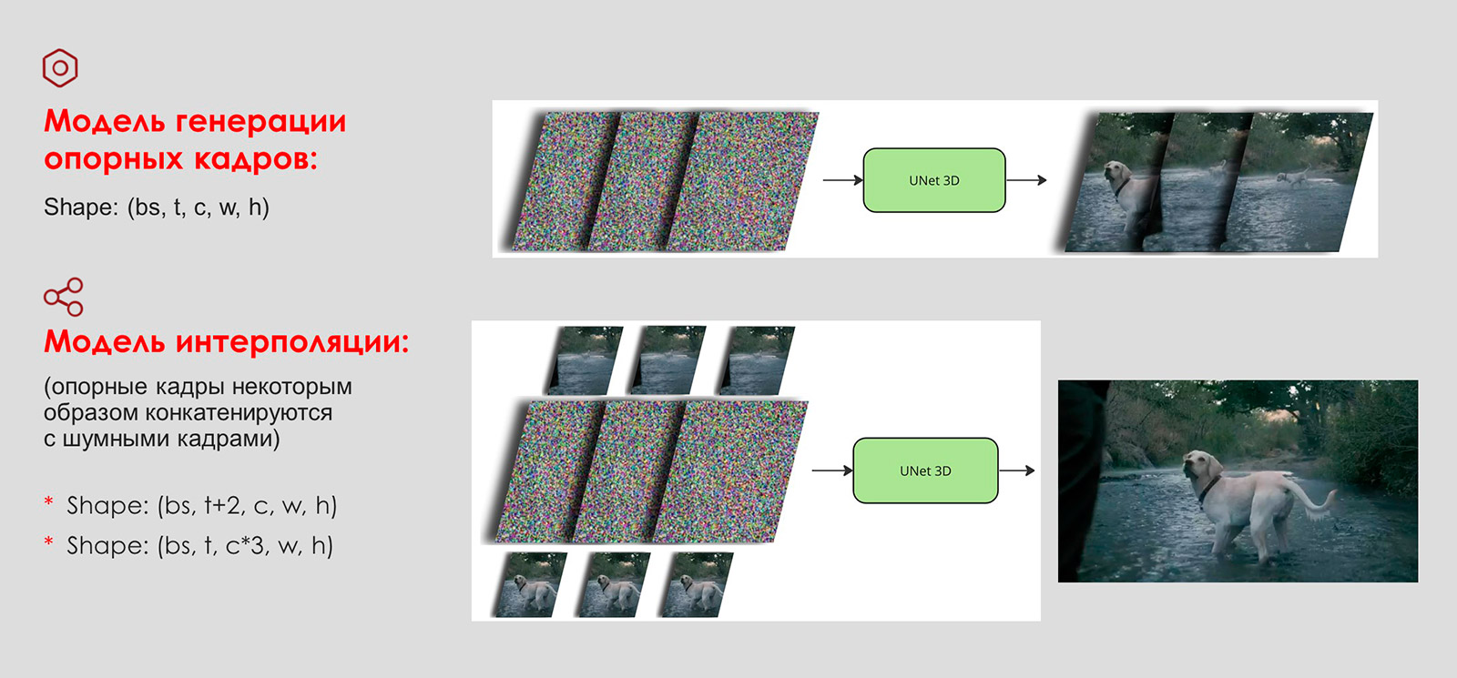 Генерация полноценных видео требует обучения отдельной модели. Возьмём пример двух моделей. В этом случае модель генерации создаёт опорные кадры, а модель интерполяции делает видео гладким, то есть реалистичным.