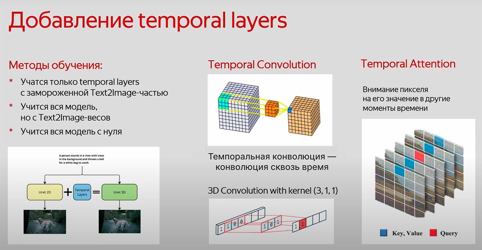 Принцип работы. Из U-Net 2D делаем U-Net 3D, добавляя темпоральные слои. Они связывают кадры в пространстве, чтобы исследовать зависимость между ними и учить их.